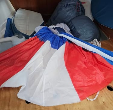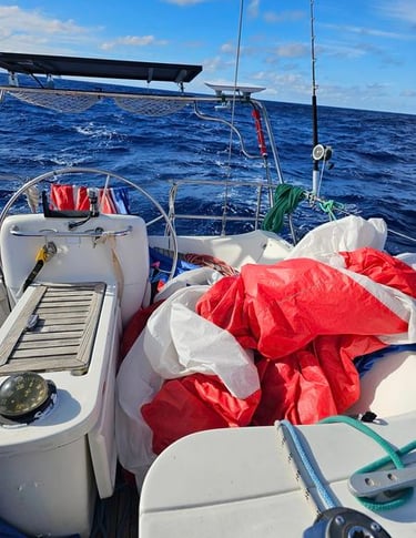 A peine eu le temps de finir ma phrase et d'aller commencer la manœuvre , qu'une vague plus grosse que les autre fait chasser le cul d'Arawak, qui part dans un méchant loff, se retrouve à 70/80 ° avec 16/18nds . Le pilote a du mal à le remettre à 110°. Même pas j'ai eu le temps de choquer l'écoute de GV, que Criiiii . Tête de spy déchirer et celui-çi va nager à la traîne sur tribord .