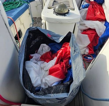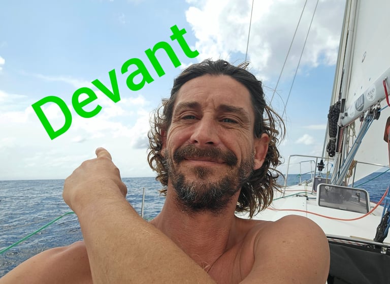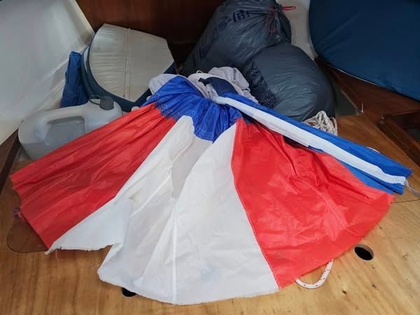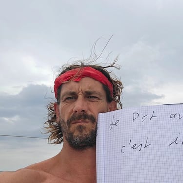 Je le remonte comme je peux sur le bateau, ça rigole, cool . Je vais vite lâcher le point d'amure pour le remonter complètement que d'un coup, les bras de Éole commence à l'embarquer dans l'eau (décidément tu aimes nager ), je tente de le retenir et impossible c'est lui ou moi, il est en pression sur les chandeliers et les filières ! Tant pis, laisse le repartir à la traîne .
