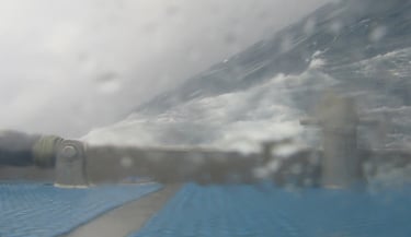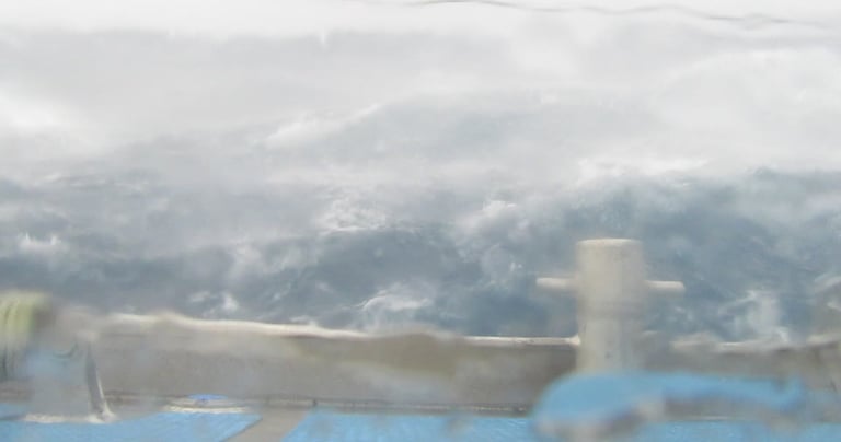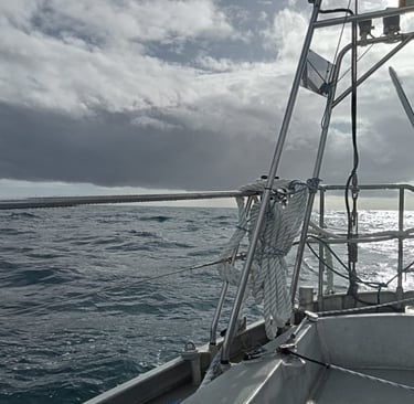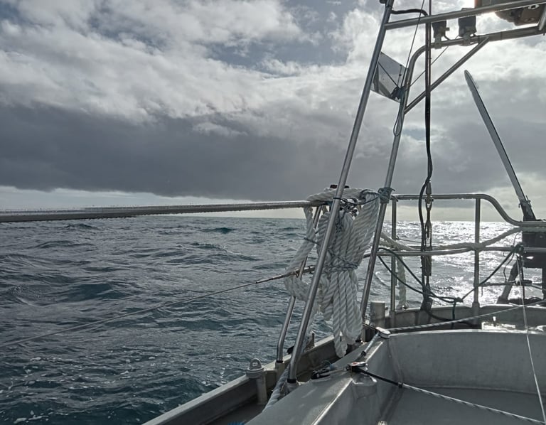 C'était une nuit de navigation assez mouvementée et rapide dans le vent de nord pré-frontal. À 8 heures du matin, j'ai décidé de faire la voile d'essai et une fois tout terminé, il y a eu de fortes rafales de NW avec des pluies torrentielles. Très occupé sur le bateau, en plus de récupérer environ 40 l d'eau de pluie. Une heure plus tard, nous étions terriblement encalminés dans la vieille grosse houle.