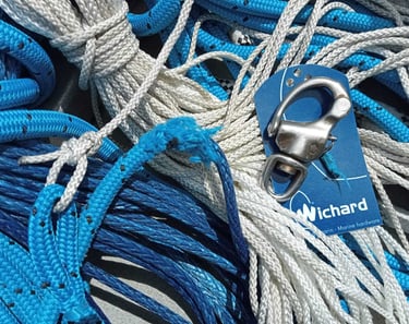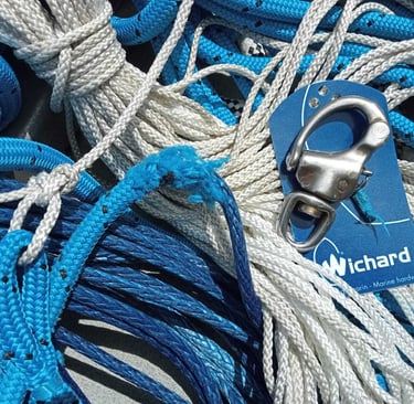 Changement de la drisse du génois/Yankee par la drisse de rechange, après que la gaine extérieure du cordage Dymeema ait complètement éraflé ! C’est un peu déconcertant que le frottement se soit produit À L’INTÉRIEUR du mât, très étrange, j’aurais aimé avoir des yeux à rayons X. Cette drisse était toute neuve au début de ce voyage.