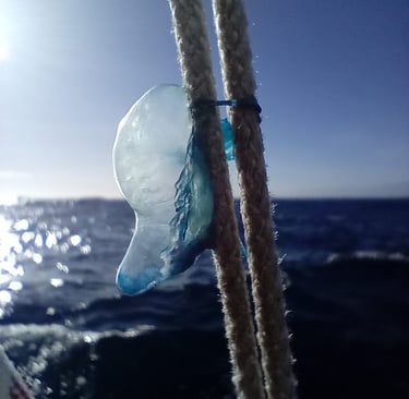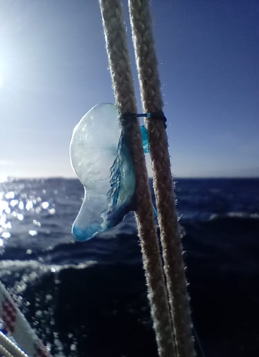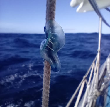 Étrangement, une méduse bébé-homme-de-guerre a explosé dans le gréement, je suis surpris de les trouver si loin au sud.