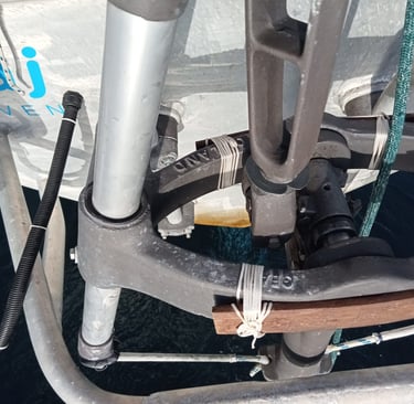 Luckily I noticed a fault on the ARIES self-steering yesterday just before major trouble happened. The 25 mm stainless steel main shaft (part # 559) had dislocated and the headed bush (# 558) was lost! The problem happened because both the grub screw and grub bolt (# 554) were gone! I quickly found the spare bush and made a wild improvised repair.