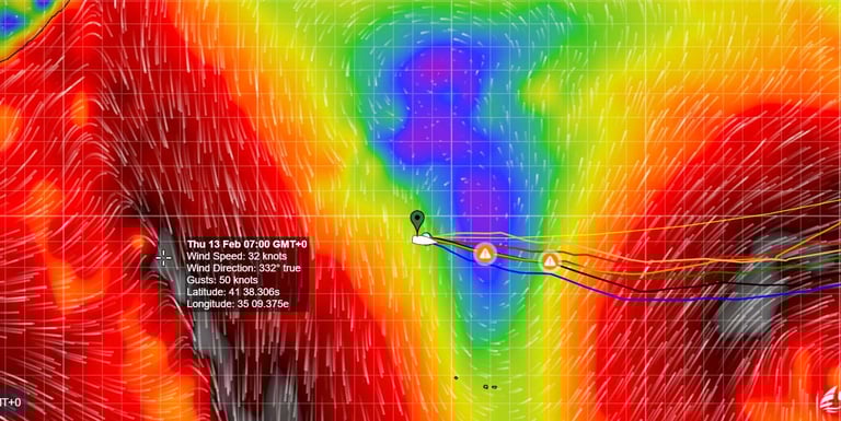 Le front froid nous a dépassés au petit matin avec une brève rafale de vent de F8 d'une demi-heure, suffisante pour commencer à travailler sur les voiles afin d'éviter les dégâts.