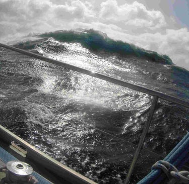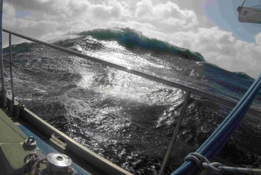 Hier après-midi, nous avons dérivé pendant sept heures, étonnant que nous ayons encore réussi à parcourir une centaine de milles sur Etmal aujourd’hui. Dériver sans voiles semble relaxant, mais c’est une lutte dans le fort mouvement de roulis dû à la grosse houle qui court toujours après le coup de vent de F 8. La hauteur des vagues était prévue pour être de 7 mètres à notre position. Dans la soirée, une brise de direction opposée s'est levée et nous naviguons maintenant sous génois, ce qui est un changement agréable.